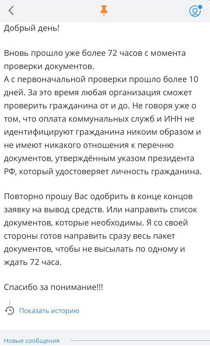 Хочу рассказать небольшую историю про БК «MELBET» Вообщем,пополняет мой знакомый счёт на 232 usd ( 15.000 рублей) Проставляет ставку по смолмаркету с лимитом в 9 рублей, чтобы не церемониться - решил поставить все деньги , но разбить их на два раза. Коэффициент: 2.83 И что вы думаете? Она заходит и на балансе 42 рубля , решил поставить на вывод - далее бк отказывает в выводе и запрашивает документы! Отправляет паспорт,карту,фото на фоне переписки , инн , снилс , счета оплаченных коммунальных услуг! Сейчас идёт 13 дней , как он не может вывести деньги Расскажу , как ведёт себя техническая поддержка БК «MELBET» По началу вроде бы кажется обычный запрос документов, как и у всей службы безопасности БК - паспорт,карты, и фото на фоне переписки - после этого обычно БК сразу же одобряет , если данные верны,но не тут то было. После основных требований любой БК,начинается самое интересно ,после каждого отправленного документа - приходится ждать по 72 ч ( 3 суток), только после этого о