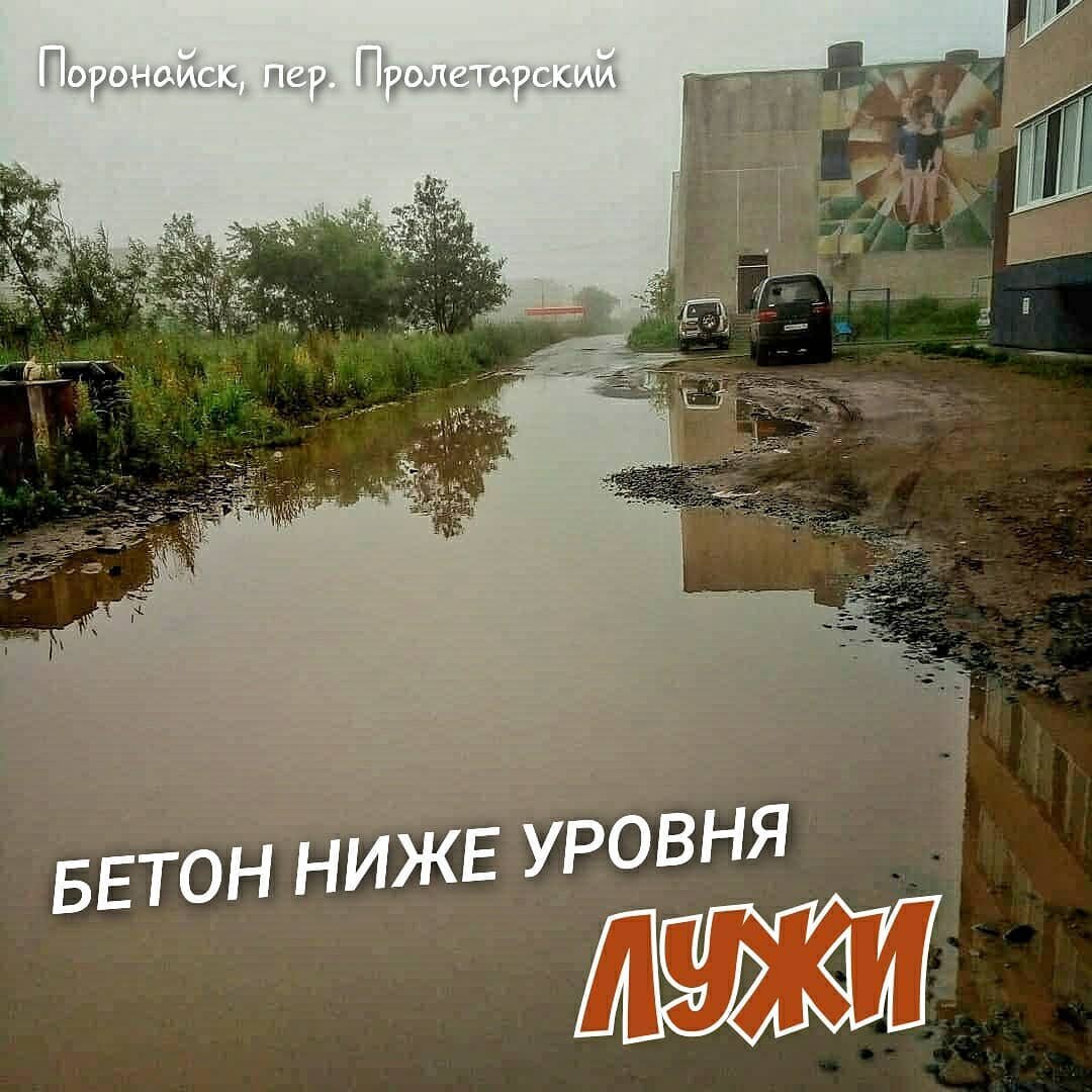 🌊Переулок Пролетарский в Поронайске. Дорога к спорткомплексу "Авангард" и стадион-площадке. Бетон покрытия ниже уровня лужи. А вокруг глина😱.