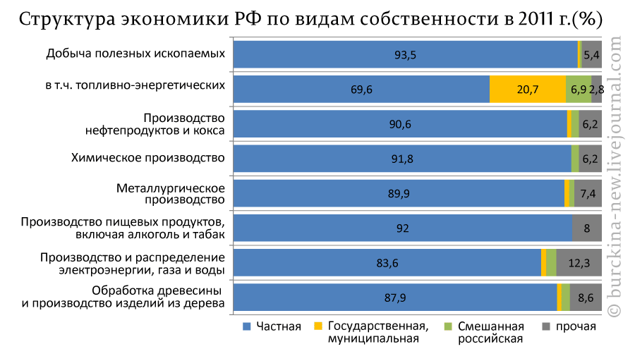Данный фейк был запущен в СМИ пару лет назад и до сих пор пользуется большой популярностью в среде охранителей типа Романа Носикова и пр. Сам фейк был вброшен системными либералами -- птенцами гнезда Егора Гайдара, высокочтимого Путиным и либералами одновременно. Такой вот показательный консенсус. При этом цель вброса была строго либеральная, а не охранительская. Фейк был озвучен руководителем ФАС, членом партии Яблоко, Игорем Артемьевым. Согласно ему утверждается, что 70% ВВП страны создаётся государством, а значит капитализм в РФ построен неправильный, не либеральный не демократический, частная собственность в нём отсутствует, а значит нужно еще больше снижать влияние и долю государства в экономике. Авторов и сторонников фейка не смущает, что данное утверждение напрочь противоречит экономической реальности России, согласно которой доля государства в собственности не превышает 18%: Кстати, если допустить, что сторонники этого фейка правы, то выходит, что 18% госсобственности создает