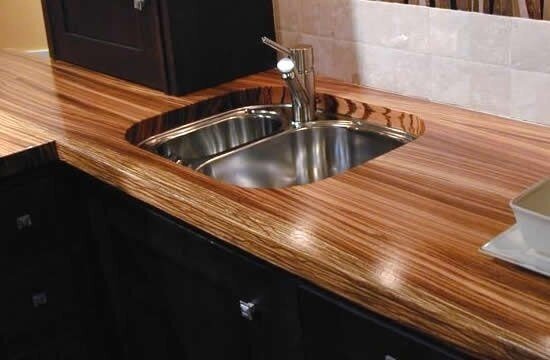 Наиболее подходящими породами дерева для изготовления столешницы является сосна, ольха, дуб, лиственница, береза. Стоимость метра изделия начинается от 2000 рублей. Полотно представляет собой щит, склеенный из наборных деревянных планок. Это позволяет получить очень прочную и красивую поверхность. Ее края поддаются тщательной фрезеровке для получения прямолинейной формы. Затем вся поверхность пропитывается специальным маслом, который не только защищает столешницы от влаги, но и придает приятный блеск. Именно от качества масла и количества нанесенных слоев зависит долговечность изделия. Если вы не ограничены в финансовом плане, то под заказ вам могут изготовить модель из экзотических пород дерева. Для гарнитура, чьи фасады выполнены из дерева или отделаны шпоном, это станет идеальным вариантом.