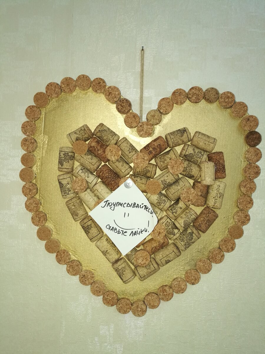 https://www.youtube.com/channel/UCAcc_e_Q6PmzRdYnCR9gztg?view_as=subscriber Всегда удобно иметь под рукой очень полезную вещь, в данном случае доску для записей. Кому то оставить послание, или напоминание ))) Сегодня я раскрою вам секрет ,как это можно сделать легко и просто! Для работы нам понадобиться: Много винных пробок, клей пистолет, плотный картон, джутовая веревка, спрей краска золотого цвета. И так приступаем к работе, вырезаем из картона форму сердца, вы можете форму для доски выбрать любую. Покрасить ее в золотой цвет из баллончика, пока краска сохнет, займемся пробками, их надо нарезать по половинкам и кружечками. Нарезать конечно сложно, но надо постараться. Чуть облегчить работу можно, если заранее замочить пробки в кипятке и проварить минут 5. Они станут немного мягче и резать и будет легче. Готовые пробки начинаем приклеивать по форме сердца, в центре нашей заготовки, по краям я приклеила пробки кружочки, для более завершенного вида. И так основная работа выполнена
