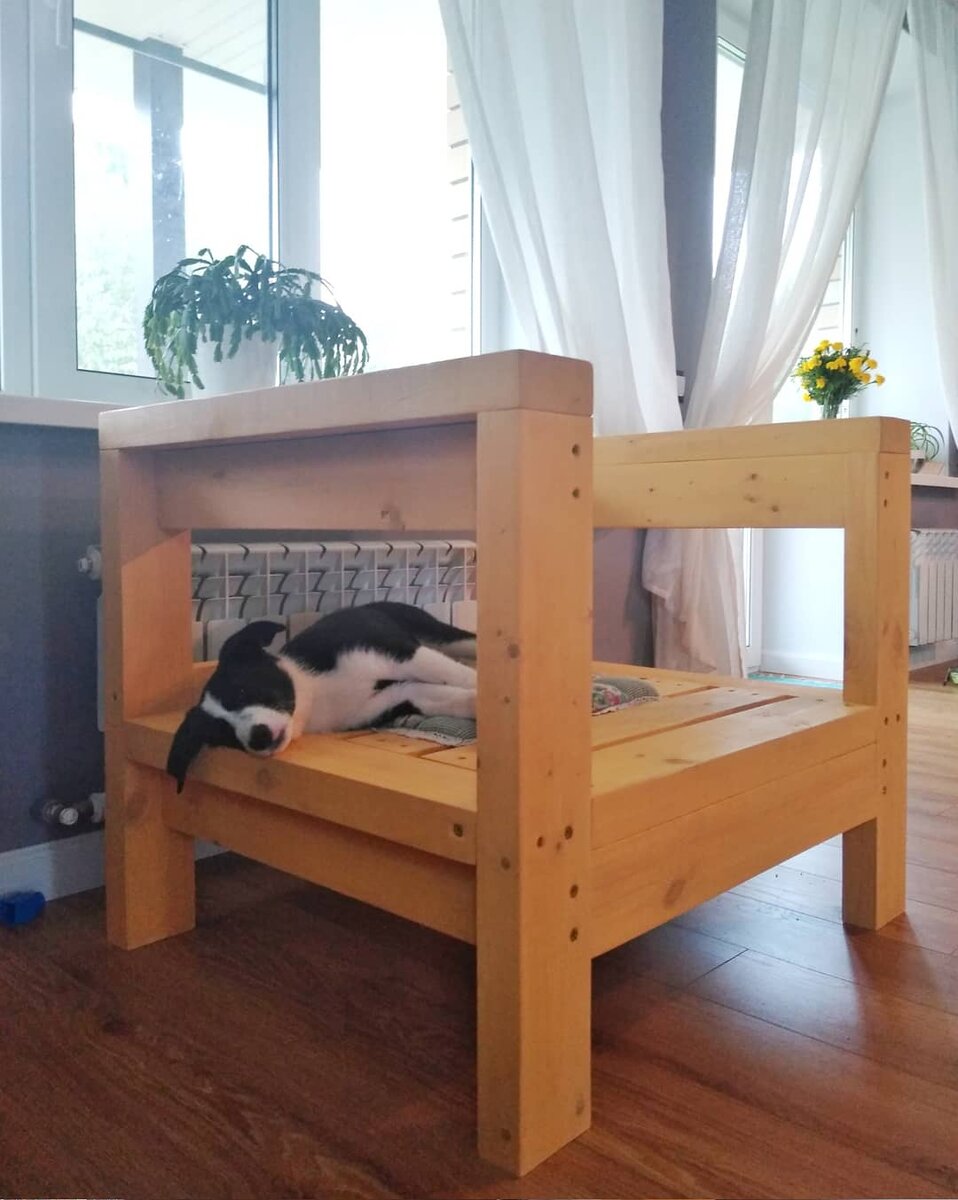 Мы полгода присматривались к диванам, но так и не нашли тот самый. Добротная мебель стоит дорого, за временную платить пол сотни тоже не хочется. ⠀ Денис предложил сделать самим, честно, я была в шоке. Он никогда не делал ничего подобного. Но свои страхи я оставила при себе, чтобы не спугнуть благие намерения мужа😂, в конце-концов у нас есть терраса на случай провала. Схемы нашли в интернете по запросу "диван в скандинавском стиле своими руками". Брус закупили на базе на 10т.р., его хватит на кресло и два диванчика. Подушки будем шить на заказ у знакомой. Думаю работа+материал в тысяч 20-25 выйдет. Кресло было пилотным, для набивания руки. Собрал Денис его за полдня. Результат нам всем понравился, честно. Кресло стало временно центром гостинной. Нам с Денисом даже не перепадает на нем посидеть😂 Покрыли бесцветным матовым лаком. Цвет желтый, муж его любит. Я смирилась. Глупо было бы что-то другое искать, если все дерево в доме такого цвета. Но, думаю, с темно-серыми подушками буде