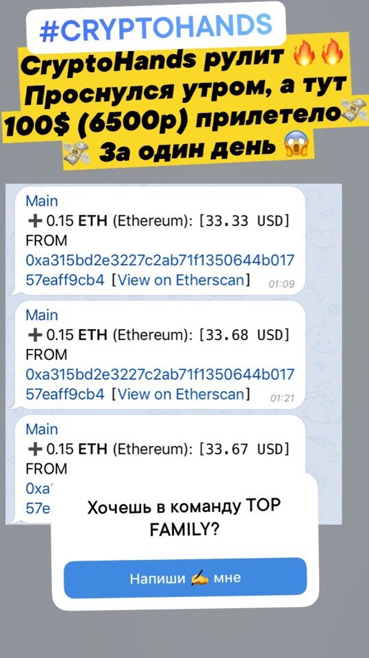 Уважаемые подписчики и гости данного канала команда "TOP FAMILY" Cryptohands предлагает сотрудничество сетевым командам или индивидуальным лицам в участии в проекте Cryptohands. Проект Cryptohands разработан на смарт-контракте сети эфириума с матричной системой.Проект Cryptohands даёт не огранниченую возможность заработка эфириума за короткое время. У нас есть для вас доказательства,что проект CryptoHands реально платит. Прилетели первые выплаты из CryptoHands Тут важно с кем вы идёте в команде. TOP FAMILY жгут. Запускаем с партнёром обучение для команды по развитию в CryptoHands. Хочешь зарабатывать от 100$ в день? За два дня ещё 100$. Хочешь так же с командой TOP FAMILY? А теперь решение за вами,стоит попробовать и заработать себе на свою мечту или пройти мимо и смотреть как другие зарабатывают. Желаю успехов с Cryptohands! С Уважением команда Top Family! Наша группа в телеграмме: https://tlg.name/topfamilycrypto Наша группа Вконтакте: https://vk.com/public184777677 Канал