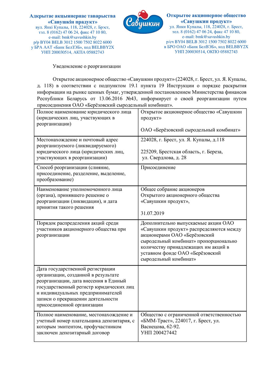 Наша песня хороша, начинай сначала. Метания "Савушкина продукта" по присоединению ОАО «Березовский сыродельный комбинат» (БСК, торговая марка «Березка») очень быстро вернулись к реализации изначального замысла . Это уже вторая попытка за последние два с половиной месяца . Первая попытка реорганизации путем присоединения была озвучена в середине мая. После этого "Савушкину" пришлось всего пару недель повозиться с увеличением уставного фонда БСК и доинвестированием 20 млн руб в соответствии со сделкой по приватизации БСК . Все эти технические и подготовительные мероприятия не мешали осуществить стратегическое слияние двух крупных активов молочной отрасли Беларуси. Но 12 июня "Савушкин" решил включить "обратку" и отменил свое решение о реорганизации. С тех пор ничего существеного в корпоративной жизни предприятий не произошло. Ну скупили еще немного в розницу ( как и было до этого) миноритарных долей и все. 71 сделка с акциями БСК за 2 мес на сумму около 150 тыс. Потенциальный проф