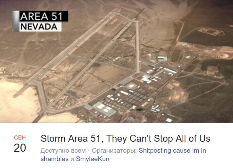 Штурм «Зоны 51» (Storm Area 51) — серия мемов, основой для которых послужило шуточное предложение о штурме Зоны 51 в Фейсбуке. Заявленная цель штурма — наконец раскрыть все секреты об инопланетянах, которые скрывает правительство США. 27 июня 2019 года в Фейсбуке было создано мероприятие под названием «Штурм Зоны 51, Они не смогут остановить нас всех» (Storm Area 51, They Can’t Stop All of Us). Дата встречи — 20 сентября. К 13 июля число участников достигло почти 500 тысяч человек. Среди них есть как те, кто относятся к данной затее, как к одному большому пранку, так и те, кто воспринял идею штурма всерьёз. Админы мероприятия опубликовали план, согласно которому должен пройти штурм: