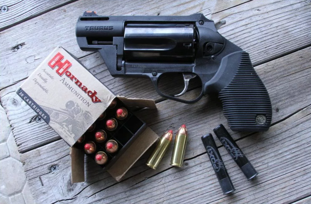 Наиболее часто используемым револьверным патроном для целей самообороны на охоте является .44 Rem Magnum. Он был создан в 1955 году и предназначался прежде всего для охоты. Применяется как в короткоствольном оружии, так и в револьверах. Применяются пули весом от 9 до 20,5 г. Начальная скорость от 350 до 520 м/с, дульная энергия в пределах 1500 Дж.