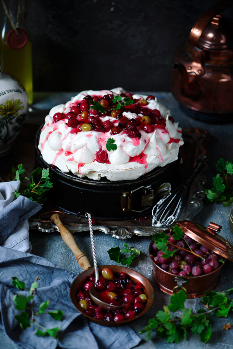 - Теперь собрать торт. На меренговый корж выложить взбитые сливки, сверху выложить крыжовник и полить сиропом.