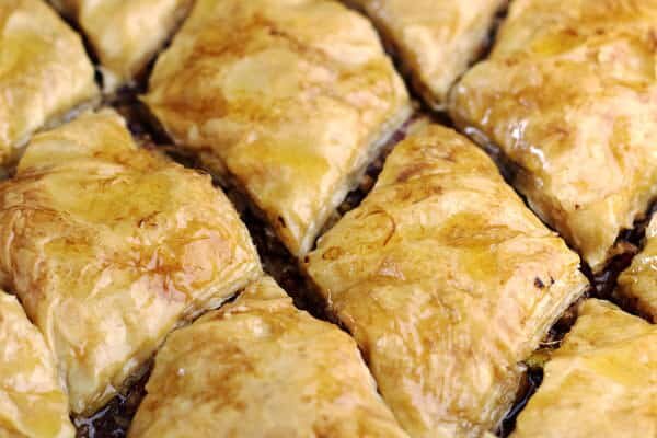 - Когда все будет готово, выньте пахлаву из духовки и немедленно налейте охлажденный медовый сироп, чтобы покрыть всю горячую пахлаву. Пусть набор, чтобы полностью впитать сироп.