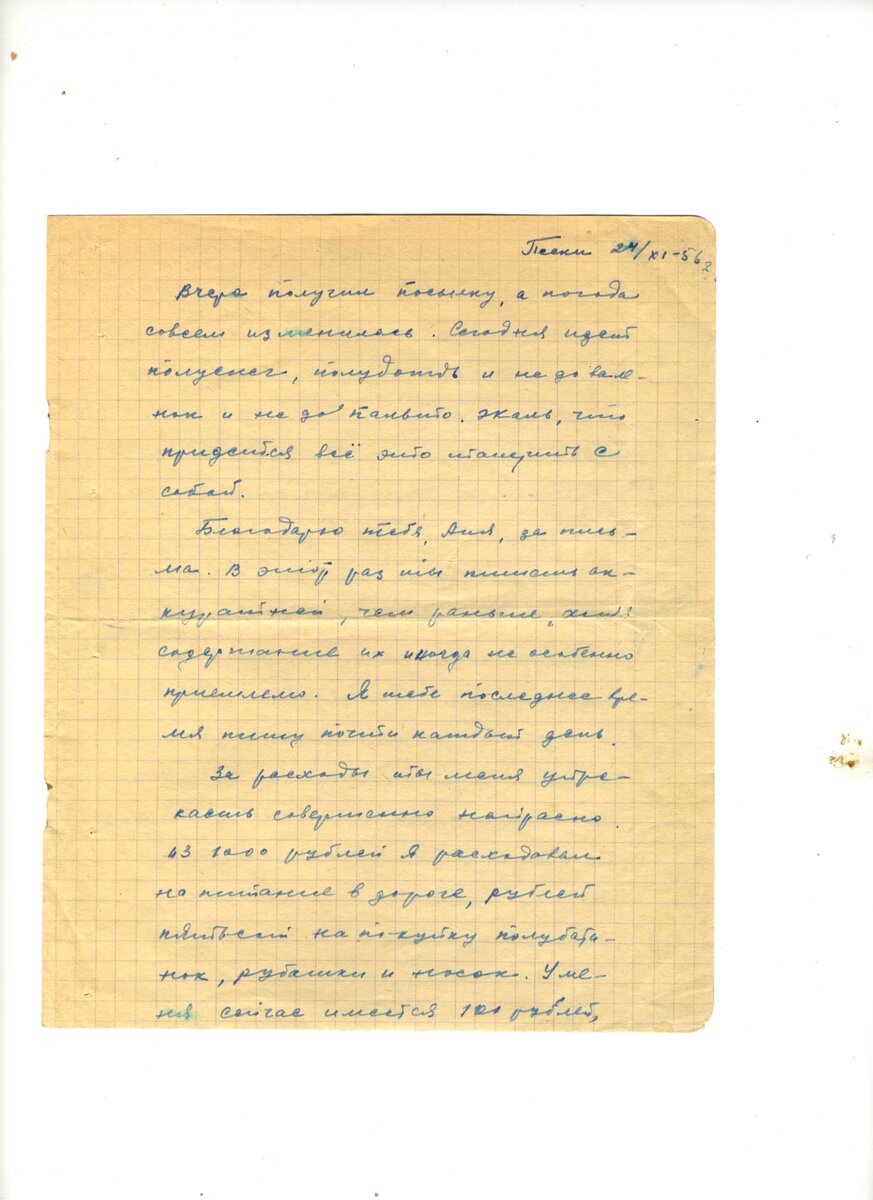 Продолжаем публиковать письма Карасёва Савелия Пименовича, его стиль эпистолярного жанра. Как он описывает природу, погоду в местах где он побывал, выражение чувств к своей любимой супруге, детям, Рассказывает и о своих друзьях, товарищах, а также наблюдения за незнакомыми людьми. Всё это написанное очень интересно, можно понаблюдать как жили люди в то время, их быт, интересы, развлечения. ТЕКСТ ПИСЬМА. Пески 24/XI-56 г. Вчера получил посылку, а погода совсем изменилась. Сегодня идёт полуснег, полудождь и не до валенок и не до пальто. Жаль, что придётся всё это тащить с собой. Благодарю тебя, Аня, за письма. В этот раз ты пишешь аккуратней, чем раньше, хотя содержание их иногда не особенно приемлемо. Я тебе последнее время пишу почти каждый день. За расходы ты меня упрекаешь, совершенно напрасно из 1000 рублей я расходовал на питание в дороге, рублей пятьсот на покупку полуботинок, рубашки и носок. У меня сейчас имеется 100 рублей, кроме высланных тобой