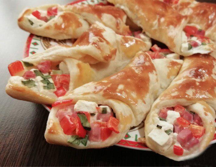 Время приготовления – 45 мин ИНГРЕДИЕНТЫ на 2 порции: Тесто слоеное бездрожжевое — 400 гр Ветчина — 100 гр Помидор — 1 шт Брынза — 60 гр Яйцо куриное — 1 шт Перец болгарский — 1 шт Лук зеленый — 10 гр СПОСОБ ПРИГОТОВЛЕНИЯ: Овощи вымыть. Помидор разрезать на четыре части, вырезать место крепления плодоножки, извлечь мякоть с семенами, нарезать очищенные пластинки кубиками. У перца удалить плодоножку с семенами, нарезать перец кубиками. Мелко нарезать зелёный лук. Ветчину и брынзу нарезать кубиками. Нарезанные овощи, ветчину и брынзу поместить в одну емкость и перемешать. Яйцо вымыть, отделить белок от желтка. Белок вылить в емкость с овощами, ветчиной и брынзой и перемешать. Начинка готова. Тесто раскатать, разрезать на квадраты. Выложить начинку в каждый квадратик из теста и завернуть. Смазать слойки желтком. Поставить в разогретую до 200°С духовку приблизительно на 15-20 минут. Подавать горячими. Приятного аппетита!