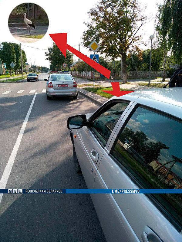 Дожидаясь приезда правоохранителей, птица терпеливо прогуливалась по нерегулируемому пешеходному переходу недалеко от места аварии. Аист пристально наблюдал за процессом оформления ДТП. И как только инспекторы закончили с формальностями, аист покинул место происшествия и улетел.
