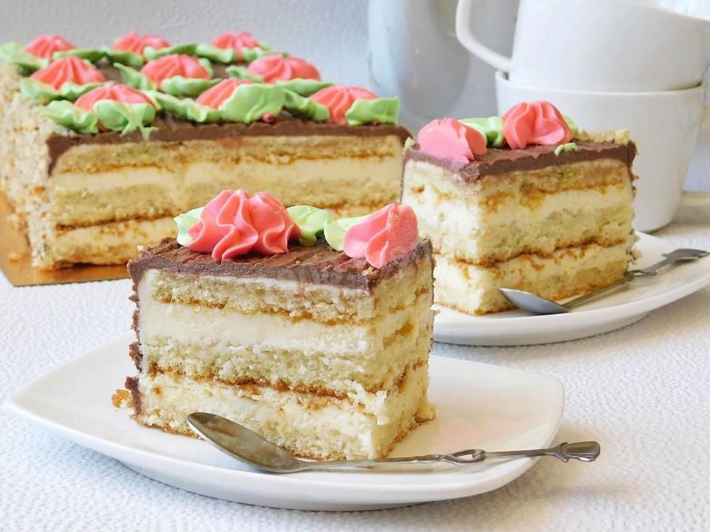 Бисквитные коржи пропитайте сиропом и прослоите кремом.