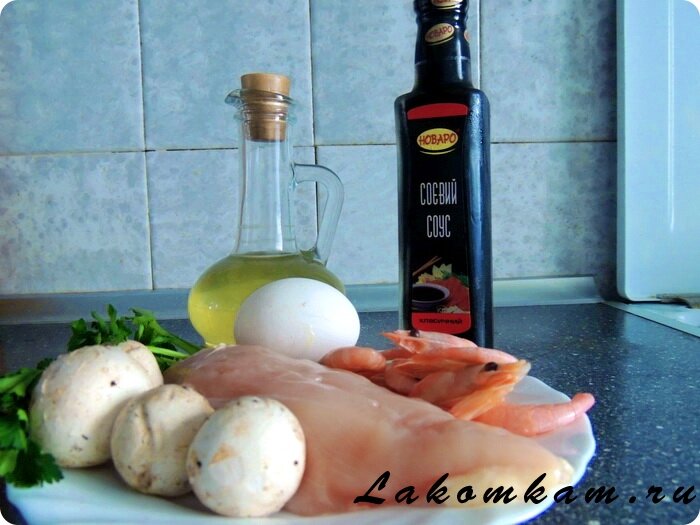В порционную пиалу выкладываем замаринованное филе, грибы и очищенные креветки.