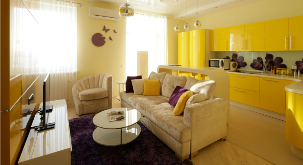 Архитектор Александра Минх создала интерьер, в котором главным действующим лицом стало солнце. В маленькой квартире разместились гардеробная, спальня, гостиная и кухня с двумя холодильниками. В плане квартира представляет собой квадрат, при входе в квартиру есть небольшой отрезок несущей стены. На плане с расстановкой мебели мы видим, что ванная комната была увеличена, что никак не отразилось на ощущении пространства в таком небольшом помещении. Отражающие свет поверхности кухонной мебели, перегородки между спальней и гостиной, журнального столика и потолка наполняют красивую квартиру светом. Архитектор не побоялась построить интерьер на контрастной цветовой гамме желтого и лилового. Фоном для этих ярких цветовых акцентов служат спокойные бежевые и молочно белые оттенки стен и мягкой мебели. На первом обмерочном плане видно, что квартира представляла собой абсолютно свободное пространство. Единственная перегородка, возведенная строителями, отделяла санузел. Так что сносить стены п