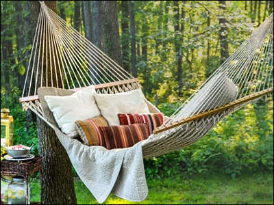 Разумеется, куда уместнее себя чувствуют гамаки на дачной территории. В них и отдыхать приятнее на свежем воздухе! А если на участке нет подходящих деревьев, не беда. Поищите специальный каркасный гамак, в комплект которых входят специальные стойки для подвешивания «морской» кровати.
