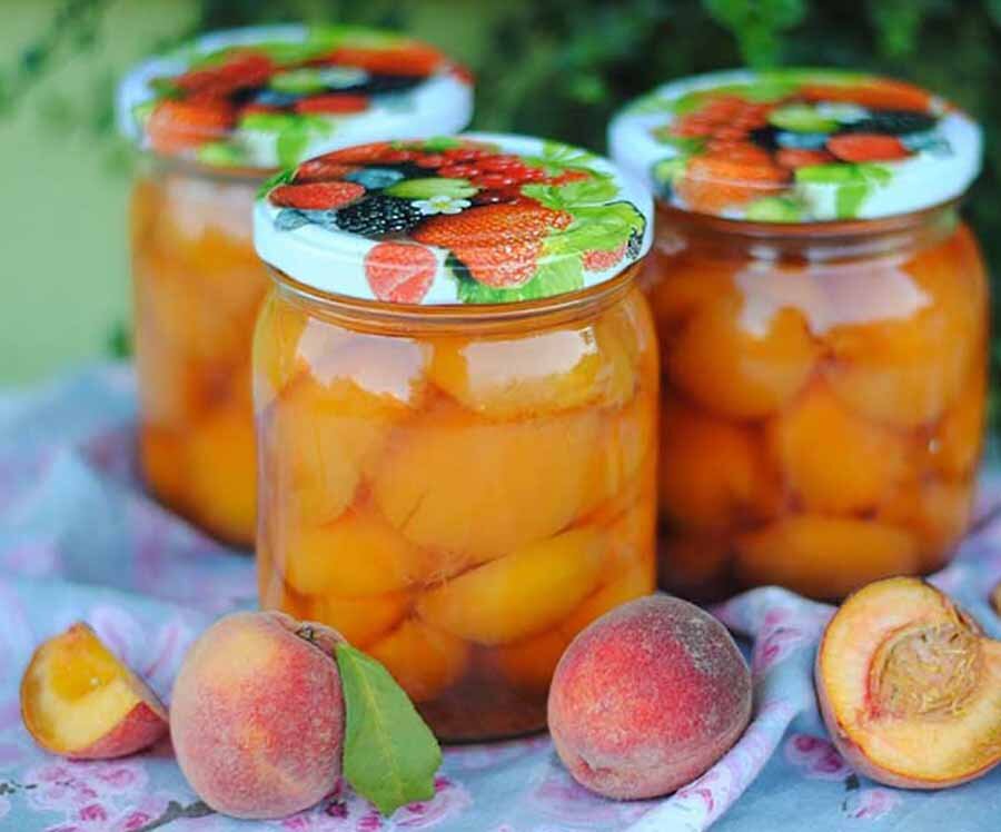 Персики - 1 кг.; Сахар - 500 гр.; Вода - 1 л.; Готовим персики без кожицы - так вкуснее. Чтобы снять ее и не повредить при этом нежные плоды, нужно выложить их в дуршлаг и опустить сначала в кипяток на 10 секунд, а затем опустить в холодную воду. Потом поддеваем кожицу в области плодоножки острым ножом, и она легко отделяется от мякоти. Разрезаем очищенные персики на четвертинки, удаляем косточки. Четвертинки разрезаем пополам и аккуратно укладываем в банки.Для приготовления сиропа выливаем в кастрюлю воду, высыпаем туда сахар, доводим до кипения, тут же выключаем огонь.Горячим сиропом сразу же заливаем персики. Ставим банки в глубокий таз с водой и стерилизуем 20 минут. Потом закатываем чистыми крышками.