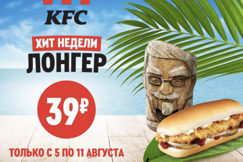 KFC ЛОНГЕР ХИТ НЕДЕЛИ ЗА 39 РУБЛЕЙ С 5 ПО 11 АВГУСТА