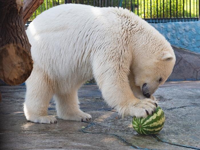 «Как ни странно, самыми большими ценители этого сезонного лакомства в Парке оказались белые медведи. Глядя на то, как наши Аврора и Феликс едят арбузы, можно подумать, что в Арктике, на их родине, арбузов больше, чем нерп и тюленей. Арбузы они получают не в первый раз и знают, с какой стороны их нужно есть, а что в них не съедобно. Каждый медведь получил половинку арбуза», - сообщают в группе. Перед подачей лакомства арбузы были тщательно проверены на содержание нитратов – можно не беспокоиться за здоровье мишек.