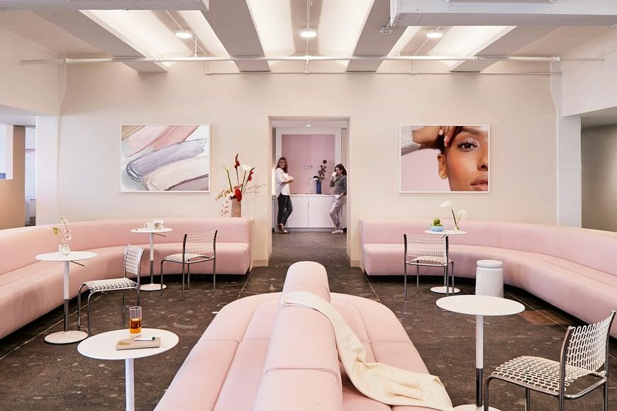 Цвет в этом интерьере офиса известной косметической компании стал элементом корпоративного брендирования. Архитектор Рафаэль де Карденас спроектировал офис на Манхэттене и оформил его с помощью оттенков розового цвета и ярко-красных акцентов. Центр интерьера – лаунж с модульной мебелью. Кроме лаунжа планировочная программа включает отдельные кабинеты специалистов, террасу, зону рецепции, переговорные, кухню и блок душевых. Кроме предметов, специально разработанных автором для этого проекта, есть несколько узнаваемых моделей компании Max Lamb– это стулья серии LastStoolsи столики Arper. В зоне рецепции установлен черный напольный светильник Periscopio дизайнеров Данило и Коррадо Арольди. Кроме того, есть и винтажные вещи – стулья Weiman Preview в стиле ар-деко, столики Джанфранко Фраттини и даже чугунная литая садовая скамья 40-х годов прошлого века. Белые стены, бетонные полы, сливочные и карамельные акценты создают нейтральный фон для предметов розового цвета. Любопытно, что все элем