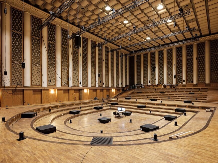 Берлинское бюро New Tendency превратило комплекс радиовещания времен ГДР Funkhaus (архитектор Франц Эрлих) в несколько музыкальных студий со вспомогательными помещениями под одной крышей. По словам авторов проекта, они старались сохранить дух времени, а собственно новизну вносить при помощи объектов интерьера. Так, в лобби установлены скругленные диваны, образующие соразмерные человеку «островки жизни» в довольно большом помещении. «Вообще, оригинальное здание имеет на плане круглую форму, поэтому скругленные диваны – аллюзия на архитектуру», - утверждают архитекторы. Кроме этих элементов дизайнеры создали серию модульных стоек, столов и консолей. Святая святых нового комплекса – главная студия звукозаписи, лаунж с видом на реку Шпрее. Всего таких студий насчитывается восемь, причем дизайнеры бюро New Tendency спроектировали для них практически все звуковое оборудование, разительно отличающееся от серийных аналогов.
