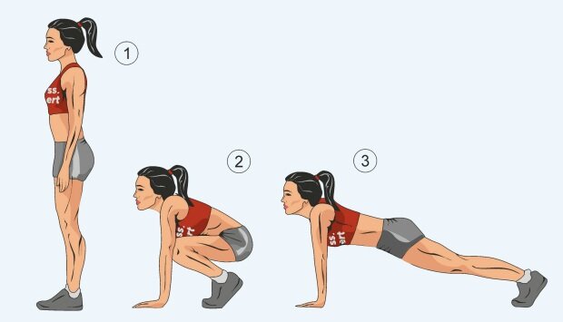 Берпи Берпи (burpee) прекрасно своей простотой и прямолинейностью. Ничего сверхъестественного и сложного, легко заучить, легко повторить, выполнять можно где только хотите. Отвечая на вопрос, какое конкретно влияние берпи оказывает на организм, необходимо отметить, что во время тренировок необходимую нагрузку получают все суставы и мышцы. Вы буквально почувствуете, что изнеможены, уже после нескольких подходов. Сильнее всего работают мышцы верхнего плечевого пояса, брюшного пресса, а также икроножные и ягодичные мышцы. Однако главной причиной популярности упражнений берпи является возможность сжигания рекордного количества калорий и значительное увеличение выносливости. К тому же берпи можно использовать как эффективный интервальный кардиотренинг: просто делайте двухминутные паузы после каждого подхода из 30 секунд берпи. Техника упражнения Берпи Все очень просто - следите за гифкой: 1. Присесть, упершись руками в пол — исходное положение. 2. В прыжке совершить перемещение ноги назад и