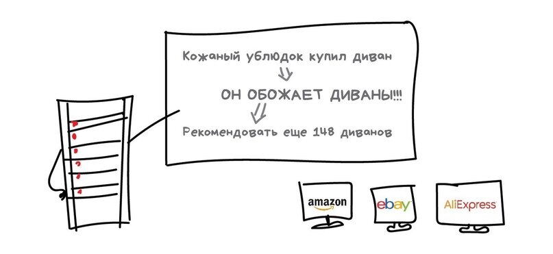 Бывают не очень удивительные попадания. Например, коллега утверждает, что не искала свадебные платья, хоть и собиралась замуж, а поисковик-зараза все-таки начал их предлагать. А потом, спустя три месяца после свадьбы, почему-то начал предлагать товары для новорожденных, хотя детей она не планировала. Тут вроде все логично и можно обойтись без теории заговора.