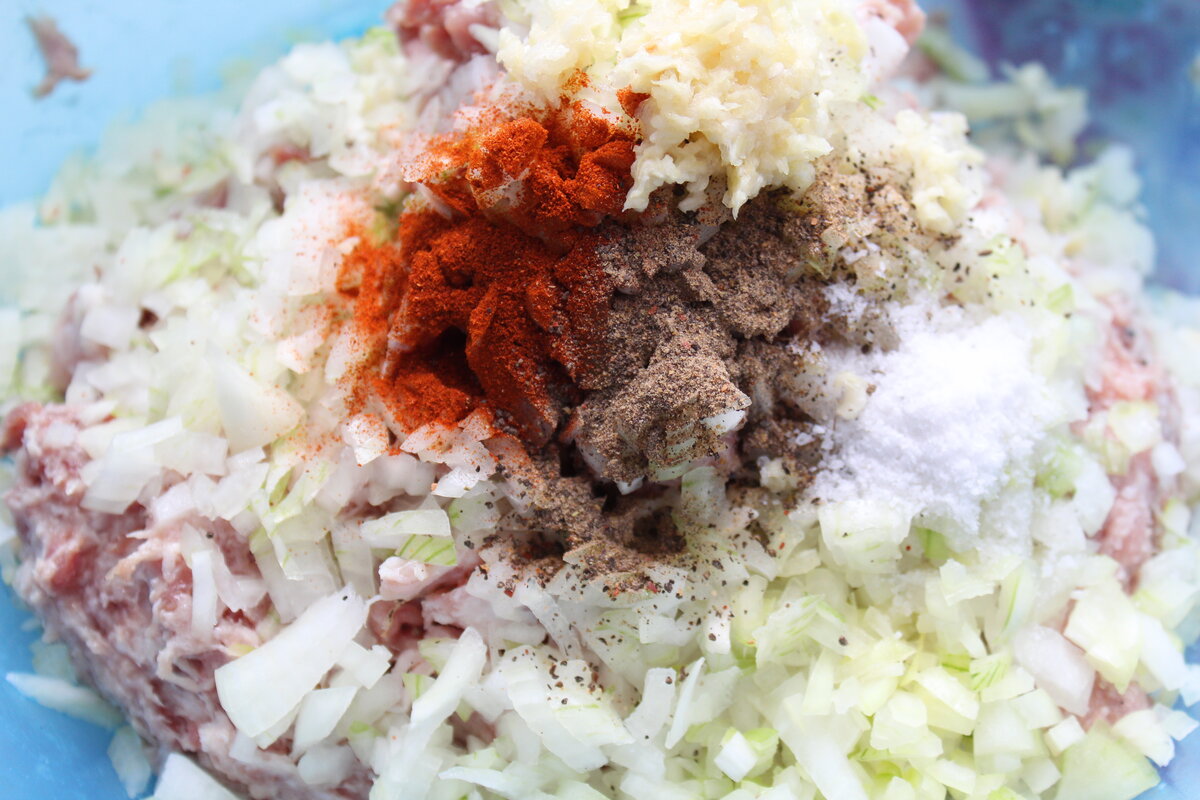 Зайчатину или мясо барсука найти сейчас довольно проблематично, поэтому готовить начинку будем из смеси говяжьего и свиного фарша, с большим количеством мелко нарезанного лука. Добавляем по вкусу соли и специй, не лишним здесь будет и чеснок.