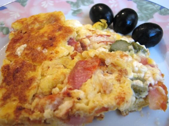 ТРЕБУЕМЫЕ ТОВАРЫ 150 г ветчины 5 яиц 3-4 маринованных огурца 80 г сыра СПОСОБ ПОДГОТОВКИ ОМЕЛЕТА Ветчину и огурцы нарезать соломкой. Яйца перемешивают до получения однородной смеси. Ветчина, огурцы и сыр выкладываются на горячую тефлоновую сковороду и покрываются яйцами. Через 2-3 минуты омлет поворачивается и после этого он готов.