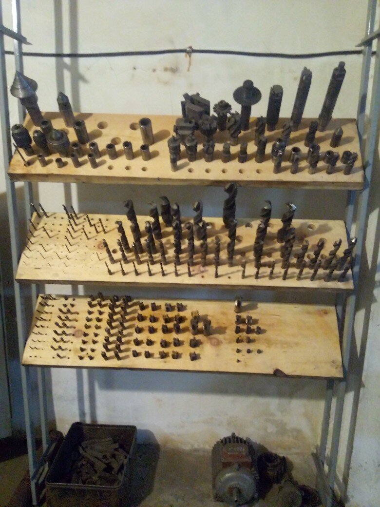 чтобы просто найти обычное сверло уходит куча времени. Ниже я прикреплю фото вариантов расположения инструмента в мастерской. Ниже на фото метчики отсортированы с плашками комплектами по шагу резьбы. Становиться более понятно какие метчики есть, а каких плашек нет. Такой стеллаж удобнее крепить между сверлильным и токарным станком в общей доступности. Инструмент требуется и тут и там, и затратится минимум усилий на поиски если подписать его еще и белым маркером. Подвесной стеллаж экономит пространство в небольшом помещении Неправда ли отлично смотриться. Порядок на рабочем месте благоприятно влияет не только на