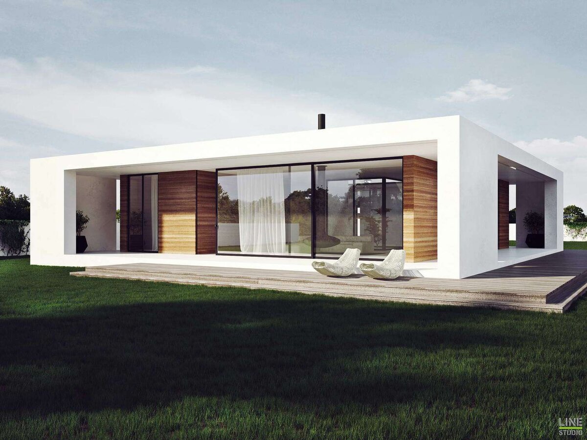 Архитектура: LINE STUDIO В основе формообразования – принцип «объем в объеме». Внутренний прямоугольный объем помещений дома охвачен внешним объемом оболочки, в результате чего по периметру дома образуется крытая галерея. Отличие объемов подчеркнуто материалами отделки: внутренний объем – яркое теплое дерево, внешний – монументальный белый бетон. Плоскостной характер формы усиливается придомовой террасой и эксплуатируемой кровлей с газоном и площадкой для отдыха. Планировка дома предусматривает организацию помещений вокруг патио. Группа приватных помещений находится в