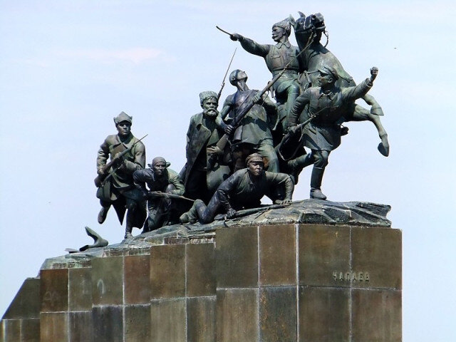 По правде говоря, достопримечательностей в Самаре не так уж и много, но даже и те мы не успели осмотреть полностью, поскольку во второй половине дня пошел такой ливень, что город затопило (в новостях потом показывали народ, идущий по колено в воде, медленно плывущие по дорогам машины и прочие прелести). Так что побывали мы в бункере Сталина (о нем в следующей части), рядом с которым площадь Чапаева с памятником ему же.