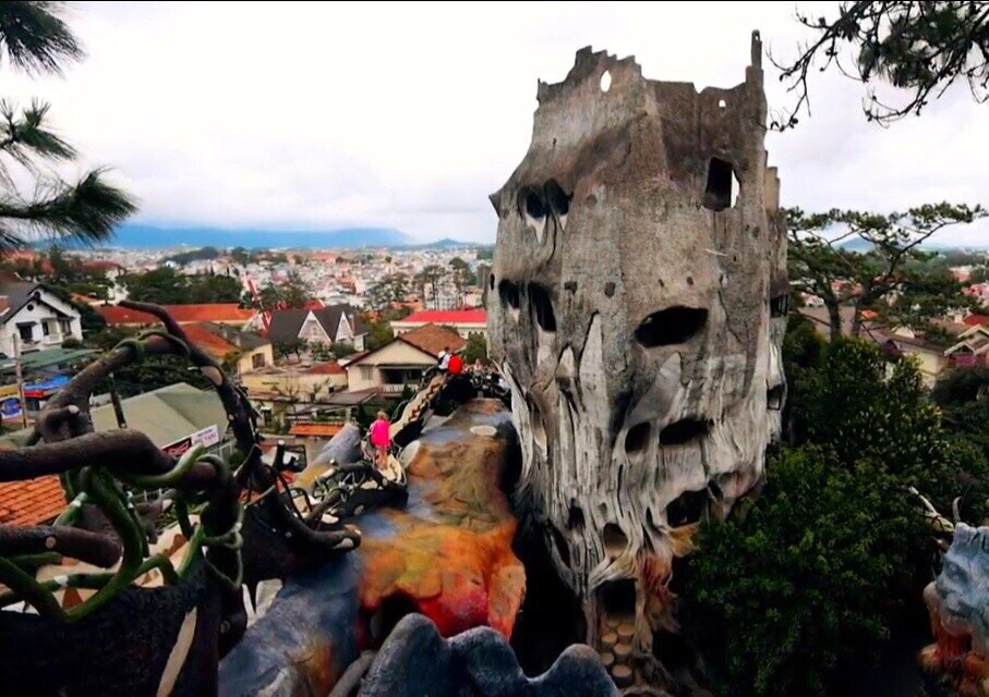 "Сумасшедший дом" во Вьетнаме. В нашем мире, полчиняющемуся строгому ряду законов и норм, подчас человеку не хватает элемента неожиданности, новизны. И огромный наплыв туристов в необычный отель города Далат тому прямое доказательство. Отель, построенный в виде засохшего дерева одной стороны и в виде сказочного дома с другой, именуется Crazy House. Хотя изначально создательница отеля Данг Вьет Нга планировала называть его "Лунный дом" и сделать местом отдыха для возлюбленных. Внешний вид отеля довольно необычный: сюрреалистичное здание почти не имеет прямых углов и построено не по-фэн-шую, чем вызывает неприязнь и осуждение местных жителей. Часть отеля имеет вид сказочного домика, поросшего мхом, паутиной и разноцветными сталактитами. Перед вход стоят фигурки грибов, имеющих человеческие лица. С обратной стороны здание приняло форму огромного засохшего дерева, простирающего свои ветки в разные стороны. Внутри здание имеет девять тематических комнат для гостей и маленький домик для мо