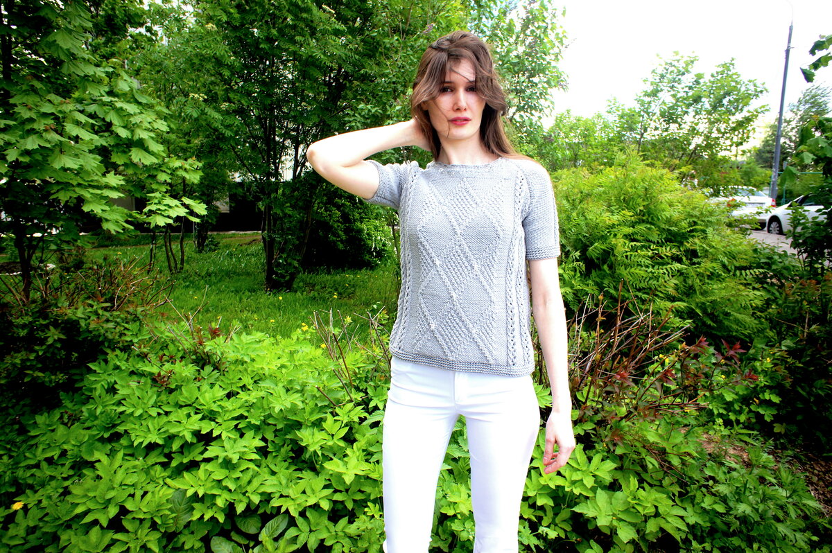 Ажурные дорожки по бокам джемпера разбавили строгость ромбов и немного «облегчили» модель — хоть это и полухлопок, но ниточка для лета достаточно толстая и я решила, что ажур тут будет не лишним.