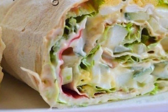 Рулет из лаваша, с крабовыми палочками и листьями салата