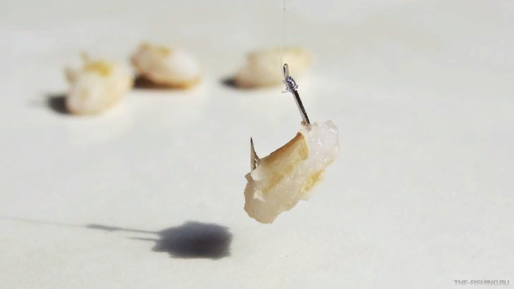 Насаживаем по одной перловке Чтобы перловка надежно держалась, насаживать ее на крючок лучше со стороны выпуклой спинки. Это часть зерна, противоположная желобку или бороздке. Если зерно не было начисто отшлифовано, то на его спинке останется оболочка, которая поможет перловке прочнее удерживаться на крючке. Перловка прокалывается крючком с одной стороны, проходит сквозь тело в продольной оси зерна и выводится с другой. Допускается прокалывание оболочки зерна. При ловле крупной рыбы на фидер, несколько перловок можно насадить следующим образом: