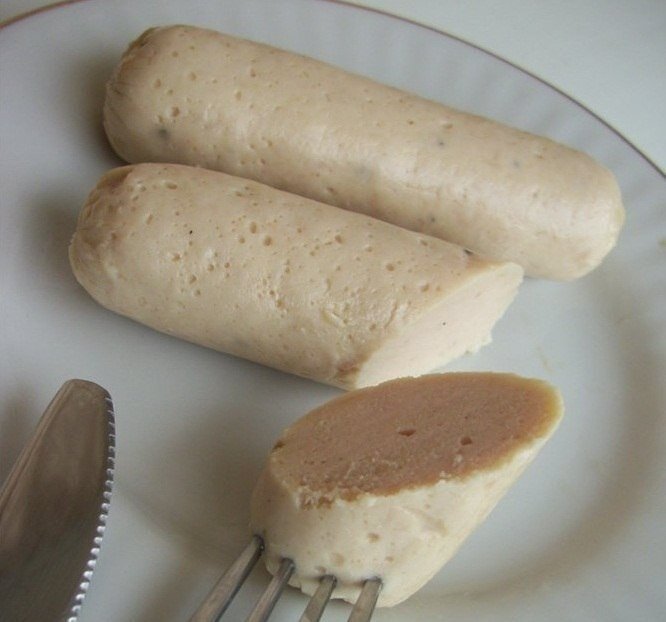 Домашняя варёная колбаса Вдвое меньше калорий, чем в покупной, да и сделанная своими руками))) Итого на 100 грамм 107 ккал Б/Ж/У 16.7 / 3.6 / 1.1 Филе куриное (или индейка) — 700 г Сливки (я брала молоко, получилось вообще 92 ккал)— 300 мл Белок яичный — 3 шт Соль Перец черный Приправы 1. Сырое филе режем на кусочки. Измельчаем охлажденное куриное (индюшиное) филе в блендере до кремообразного состояния, добавляем белки, перец и соль по вкусу. По желанию можно добавить мускатный орех. 2. Вливаем в фарш холодные сливки и перемешиваем до однородности. 3. На прямоугольный кусок пищевой пленки выкладываем 1/3 фарша, заворачиваем в колбаску и завязываем края ниткой. Так проделываем еще 2 раза. Получается 3 колбаски. 4. В кастрюлю наливаем воду и ставим на огонь, доводим до кипения и уменьшаем огонь до минимума. Вода не должна кипеть. В воду выкладываем колбаски и придавливаем их блюдцем, чтобы они не всплывали. Варим их 60 минут. 5. Вынимаем колбаски и остужаем.