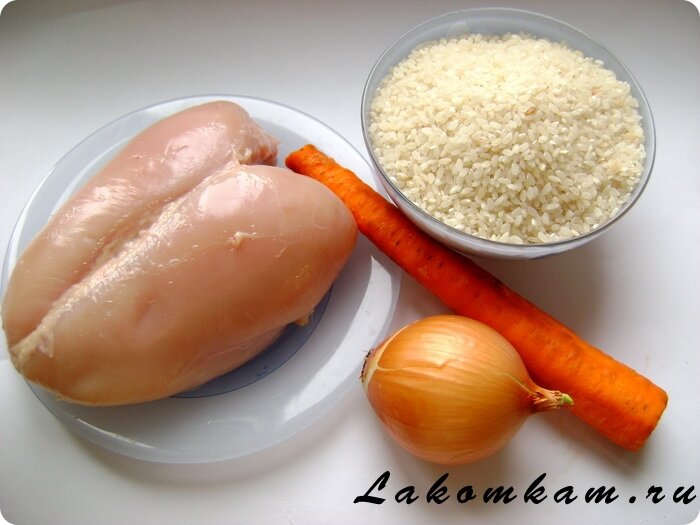 Ингредиенты: куриное филе – 700 грамм; рис – 500 грамм; морковь – 1 штука; крупная луковица – 1 штука; соль, перец, специи по вкусу; растительное масло для жарки.