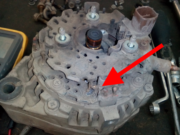 На диагностике TLC200, причина обращения - разряжается генератор, при этом контрольная лампа зарядки работает как положено. Проверяем напряжение зарядки мультиметром. Зарядки нет. Снимаем и разбираем генератор. Причиной неисправности стал вышедший из строя диодный мост.