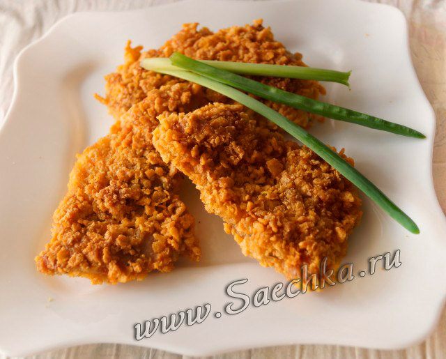 Для любителей вкусной корочки у куриного филе предлагаю попробовать панировку из кукурузных хлопьев. Если кто ел в KFC, то знает эту хрустящую курицу, её там называют стрипсами.