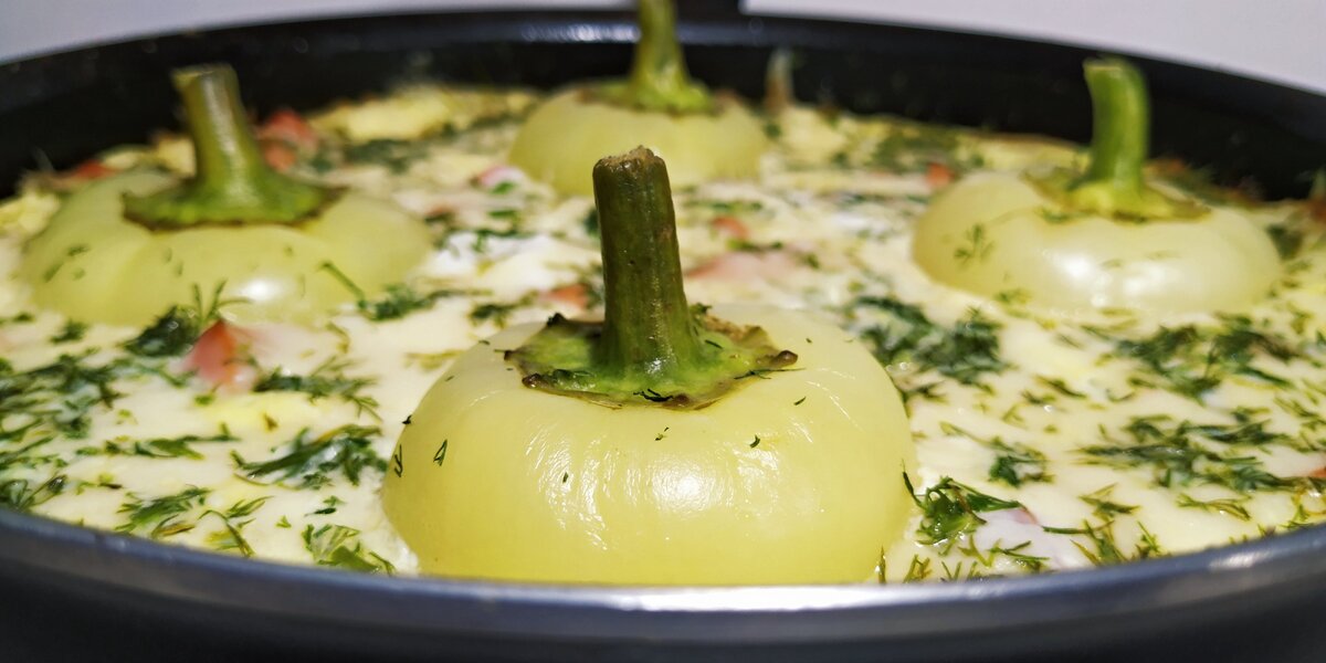 После того как картофель станет золотистым, уменьшаем огонь, сверху выкладываем обжаренные сосиски, вливаем подготовленные яйца с сыром и вставляем перцы.