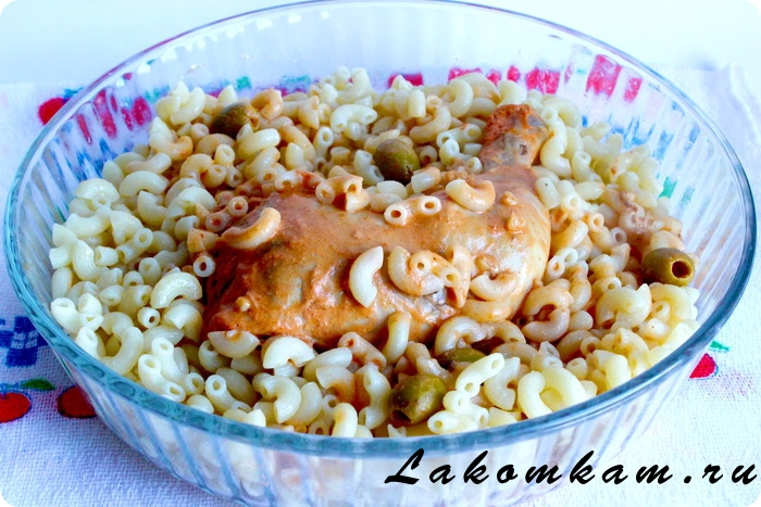 Курица в томатно-сметанном соусе с оливками и чесноком отлично сочетается с макаронами. Лучше для этого блюда брать качественные макароны из твердых сортов пшеницы.