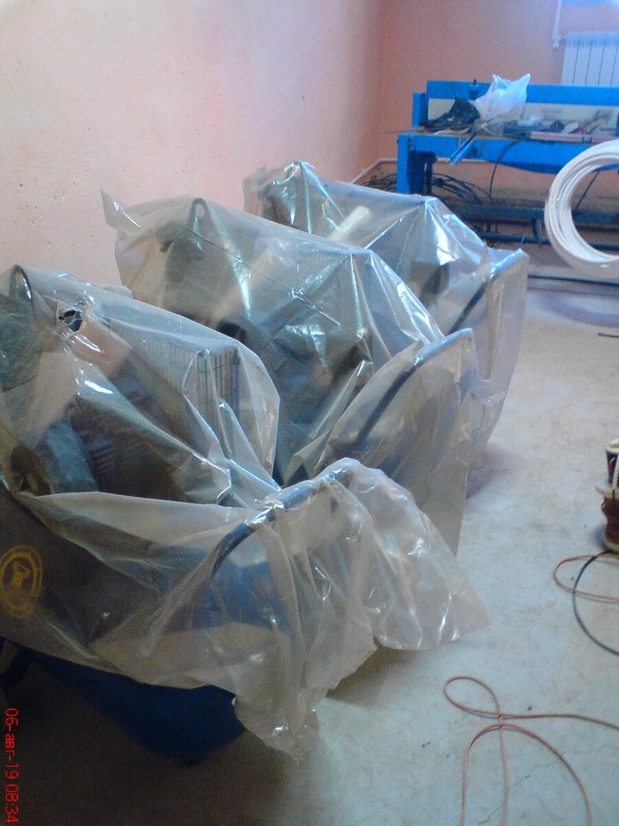 Сегодня фирма мне с напарником поручила подключить очередное оборудование работающее на сжатом воздухе. В качестве магистральных рукавов решено использовать металлопластиковую трубу. Тема для фирмы не новая и аналогичная система давно уже с успехом работает. С помощью классического слесарного набора (фото выше) садим приёмные углы на тело станины и начинаем "плясать" от станка к компрессору. Инженерное решение проверенное ранее опытным путём, это один станок + один индивидуальный компрессор. Поэтому воздушное "питание" к каждому аппарату тянем отдельно. Это хорошо видно на фото ниже. Работа "творческая" и требует особого внимания, чтобы случайно не запороть вверенный работодателем материал. Принцип монтажа и соединения трубы не чем не отличается от монтажа водопровода. Поставленная задача на сегодня выполнена, совсем уже скоро здесь "закипит" жизнь под "поющее" трио компрессоров и удары прессовых станков. Соединения металлопластика уверенно держат давление