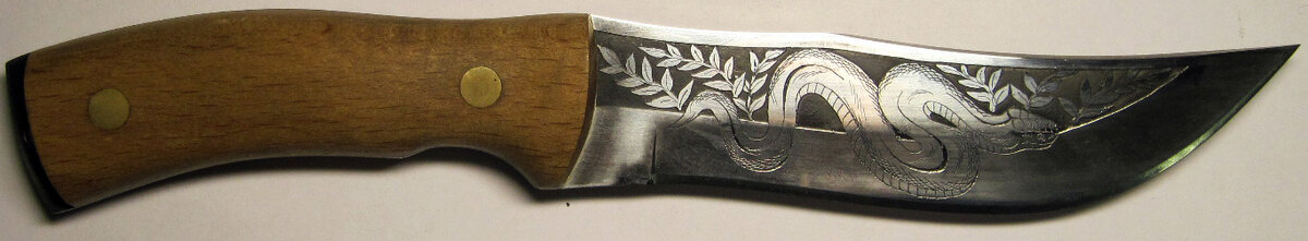 Общая длина ножа 266 мм. Клинок ножа однолезвийный длиной 143 мм, шириной 34 мм, выполнен из металла серебристо-серого цвета, с художественным оформлением в виде изображения змеи и растений (применялась вероятнее всего гравировка с последующим нанесением краски).