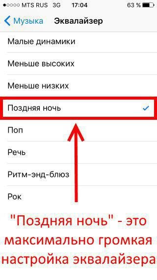3. Переходим в настройку Эквалайзер. 4. Выбираем пункт Поздняя Ночь. Готово! Теперь ваш IPhone выдаст максимальную громкость на которую способен!
