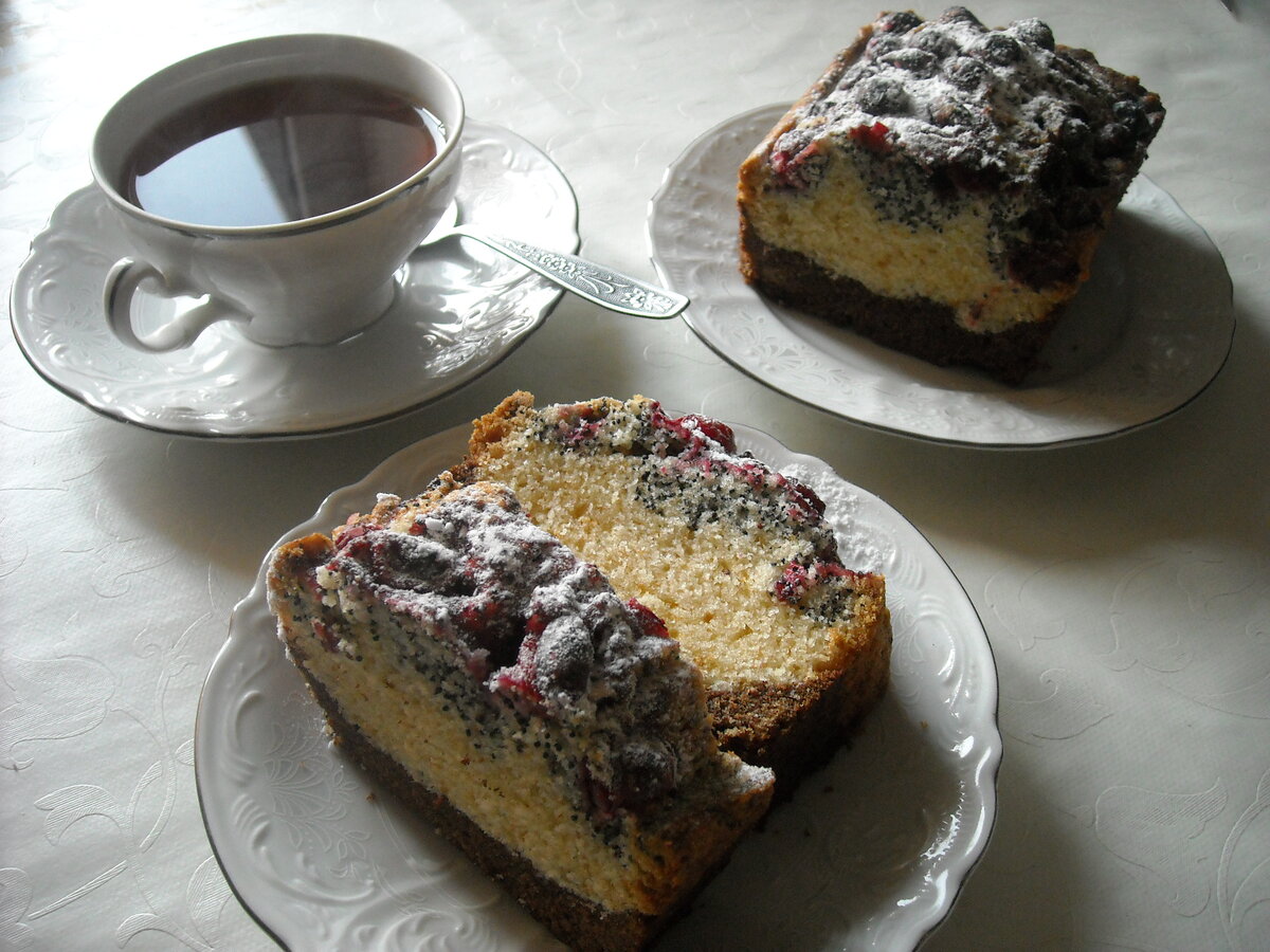 КЕКС ТРЕХСЛОЙНЫЙ с брусникой (клюквой или смородиной). Ингредиенты: 200 гр. мягкого сливочного масла, 200 гр. сахара, 3 яйца, 200-250 гр. муки, 1 пакетик разрыхлителя (10гр), 2 ст./л. коньяка, 1 ст./л. мака, 1 ст./л. какао. Масло взбиваем с сахаром, затем добавляем яйца. После каждого вымешивания - по одному. Всыпаем муку, смешанную с разрыхлителем. Получится тесто, напоминающее густую сметану. Добавим коньяк. Тесто разделим на 2 части. Одна часть остается белой (самая большая), а вторую часть делим еще на 2 части. В одну добавляем какао, в другую - мак. Выкладываем в форму первым слоем тесто с какао, вторым - всё белое, затем тесто с маком. И уже на маковое тесто выкладываем ягоды, слегка их вдавливая. Если ягоды мороженные, то можно их не размораживать, а слегка присыпать сверху (из ситечка) крахмалом или мукой. Выпекать при 180 градусах около 1 часа до сухой лучинки. Готовый кекс остудить, посыпать сахарной пудрой или покрыть глазурью.
