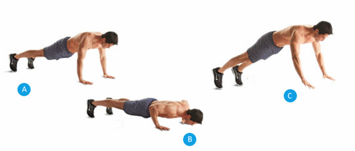 1 упражнение: взрывные отжимания Делаем 20 повторений как показано картинке выше. 2 упражнение: отжимания с ногами на возвышении Делаем 20 повторений как показано картинке выше. 3 упражнение: отжимания "лучник" Делаем 10 повторений как показано картинке выше. И последнее упражнение - это обычные отжимания на максимум!