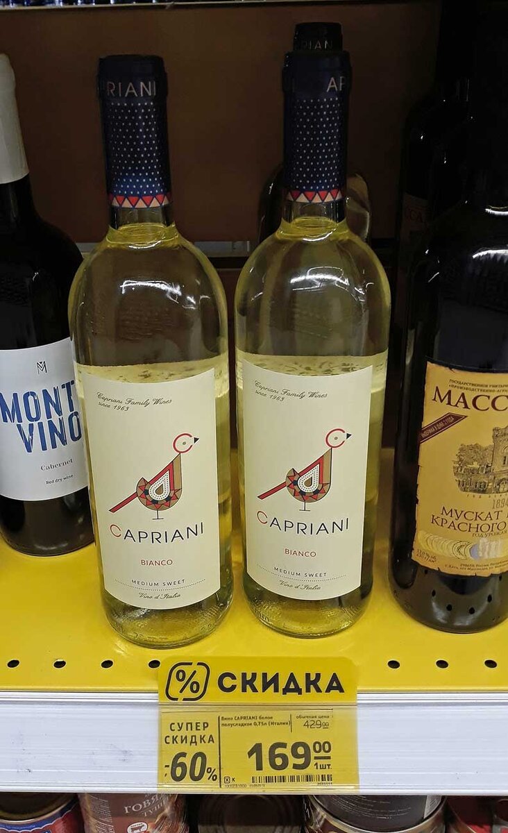 Народ радостно покупал итальянское полусладкое "Capriani" по 169 рублей. Для любителей полусладкого чем не вариант, действительно. Группа "Чевико" разливает. Вина свеженькие, из новинок. В июле были красные ценники 299 рублей.
