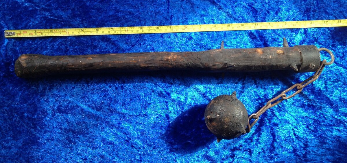 Сегодня речь пойдёт о популярном оружии, применявшемся вплоть до XIX века. Кистень – холодное оружие ударно-раздробляющего действия, состоящее из рукоятки и металлического груза, прикреплявшегося на цепи или шнуре. Груз мог быть сферической или гранёной формы. Кистень позволял наносить удары огромной разрушающей силы и обладал большой дистанцией угрозы. Атаки этого оружия было крайне сложно отразить, он был способен поражать врага за его щитом и обезоруживать противника. Ближайшим аналогом кистеня является цепной моргенштерн. От него кистень отличается меньшой бронебойной способностью, но большей надёжностью и удобством применения. Недостатком кистеня является то, что им нельзя отражать вражеские атаки, поэтому кистень был более популярен у разбойников. Также кистень широко применялся конницей, так как позволял нанести сильный удар без отдачи в руку. На фотографии выше присутствуют: 4 – боевые вилы; 5 – двуручный сферический кистень с шипастой рукоятью; 6, 7 – особые цепные моргенштер