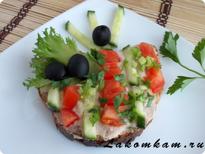 Ингредиенты: черный или зерновой хлеб; паштет из печени трески – 200 грамм; свежий огурец — 1 штука; помидор свежий — 1 штука; зелёный лук — 1-2 стебля; зелень петрушки — 1-2 веточки; маслины — 6-7 штук; листья салата для украшения.