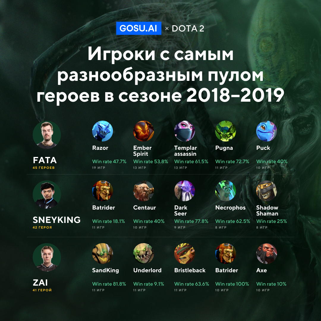 The international 2019 уже близко. DPC сезон был долгим и утомительным. Команды показывали нам свою лучшую доту, игроки трудились в попытках заполучить желаемый слот на крупнейшем турнире года. В сегодняшней инфографике мы хотим показать вам игроков, которые за время прошедшего сезона сыграли на самом большом количестве разных героев. Эти ребята потратили много усилий, чтобы предоставить своим командам как можно большую разнообразность в выборе персонажей. Для этой статистики, мы использовали игры с миноров и мажоров, а также из закрытых квалификаций к этим турнирам. Sneyking попал в данный список, немного обманув систему. Всё дело в том, что в середине сезона Цзинзнюнь Ву сменил роль с оффлейнера на роамера, тем самым значительно увеличив свой пул героев. Так что не удивительно увидеть в списке его самых популярных героев Shadow Shaman. Zai провёл невероятный сезон. Его феноменальная игра помогла Team Secret одержать победу на двух мажорах и обеспечить себе первое место в рейтинге